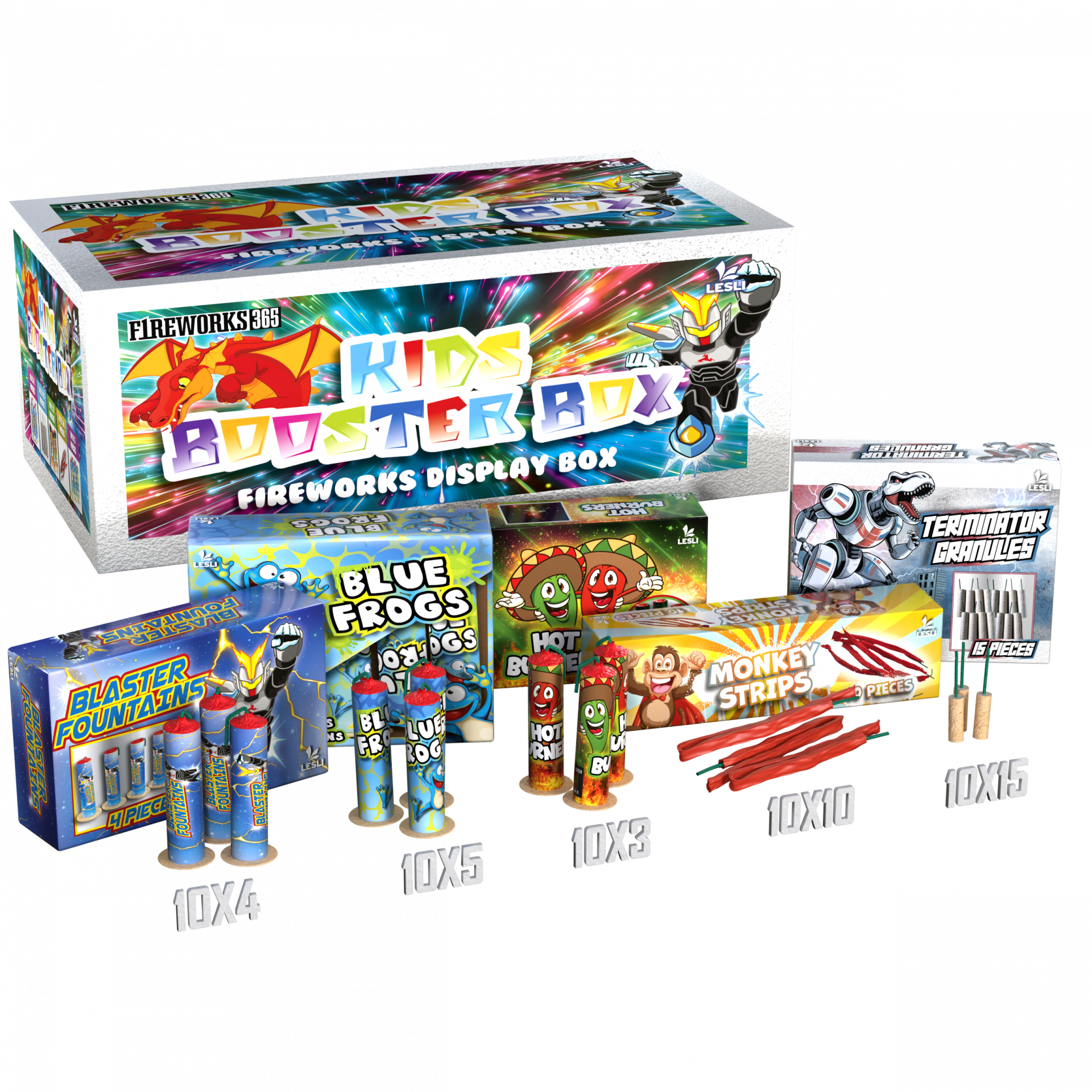 Displaydoos met extra grote pyro-pakketten voor jonge vuurwerkliefhebbers.